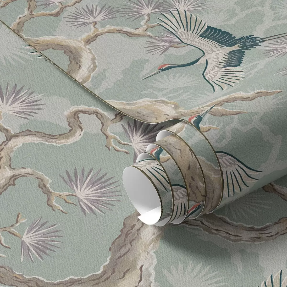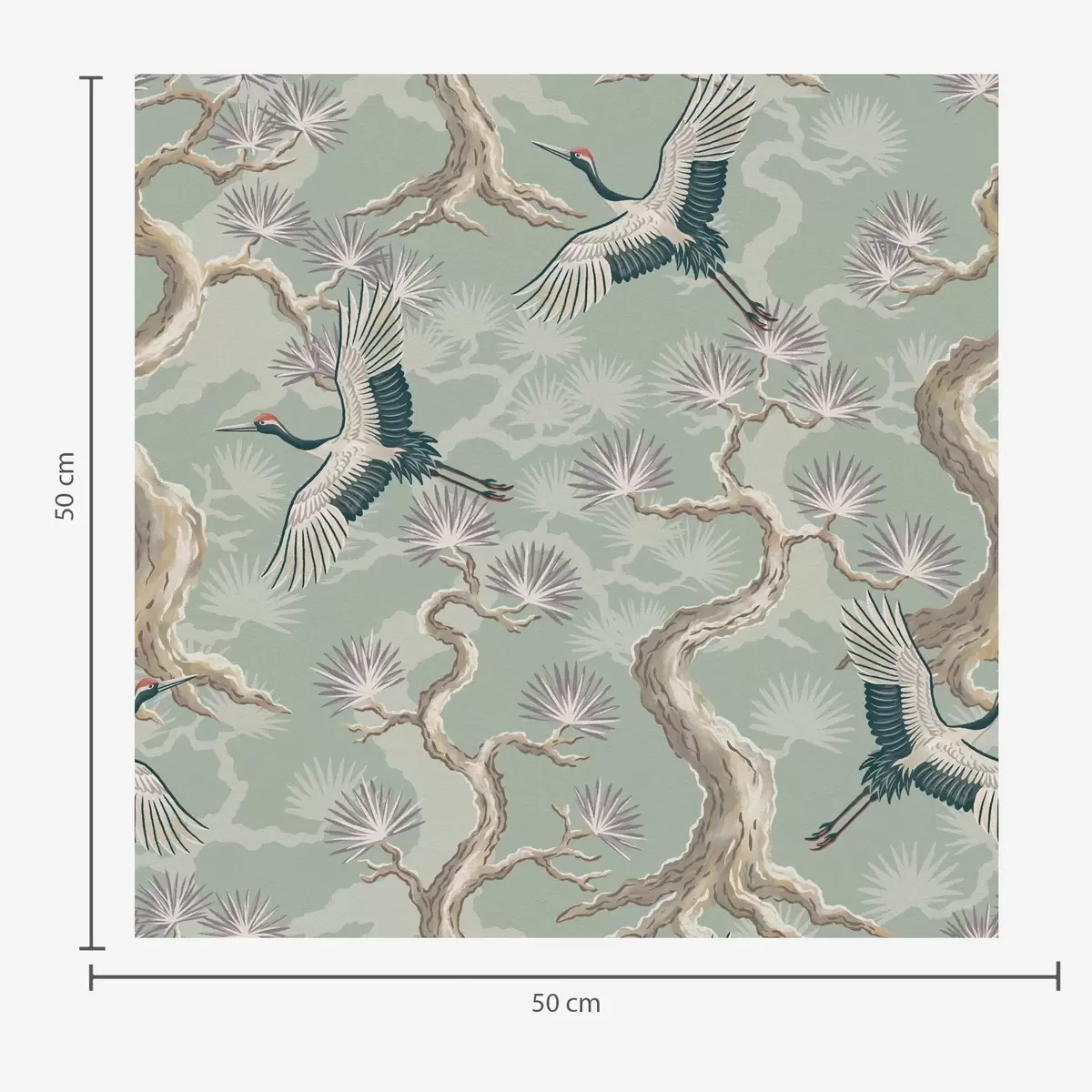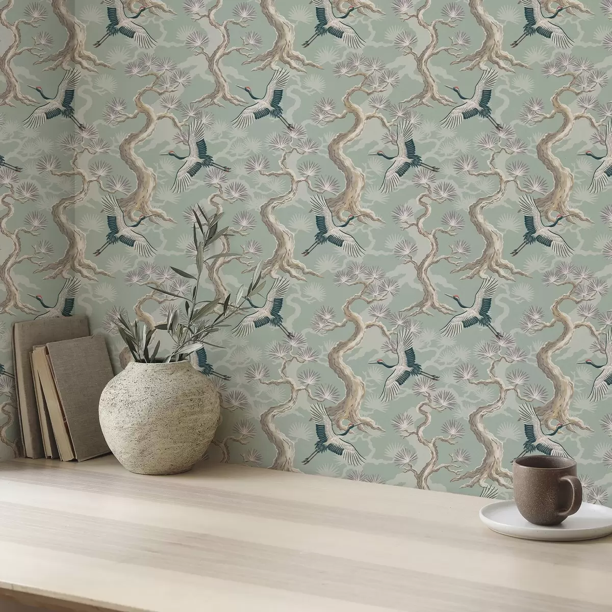 Carta da parati Gru tra rami ricurvi su uno sfondo color salvia chiaro Nr. a01023