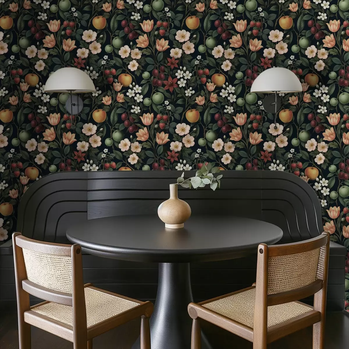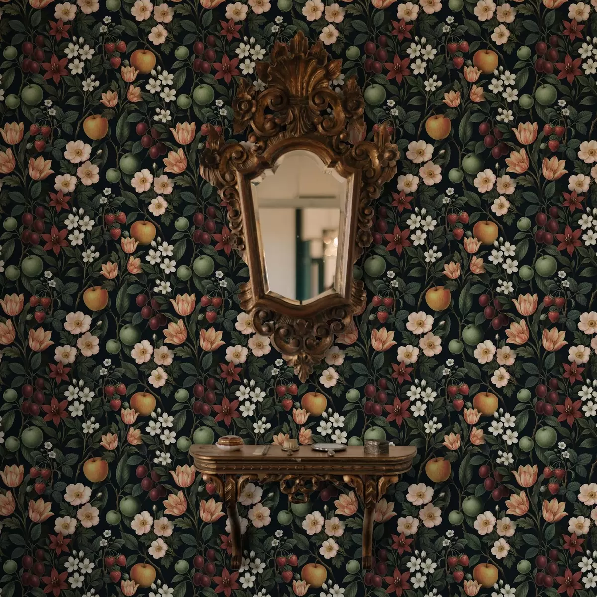 Carta da parati Giardino buio con fiori, mele mature e bacche a01034