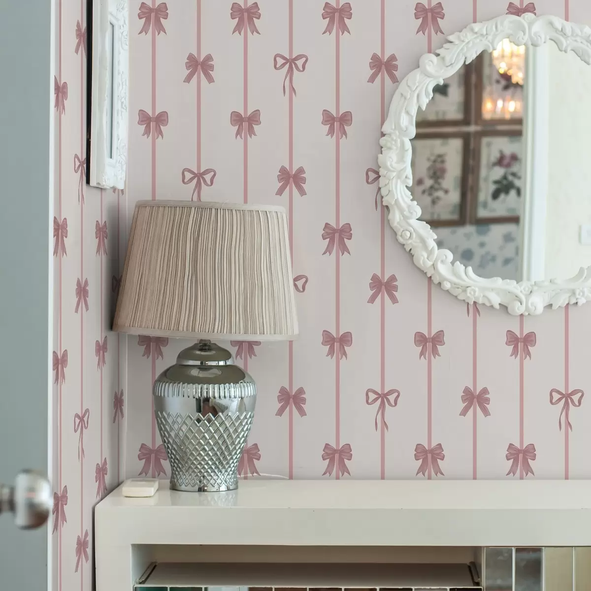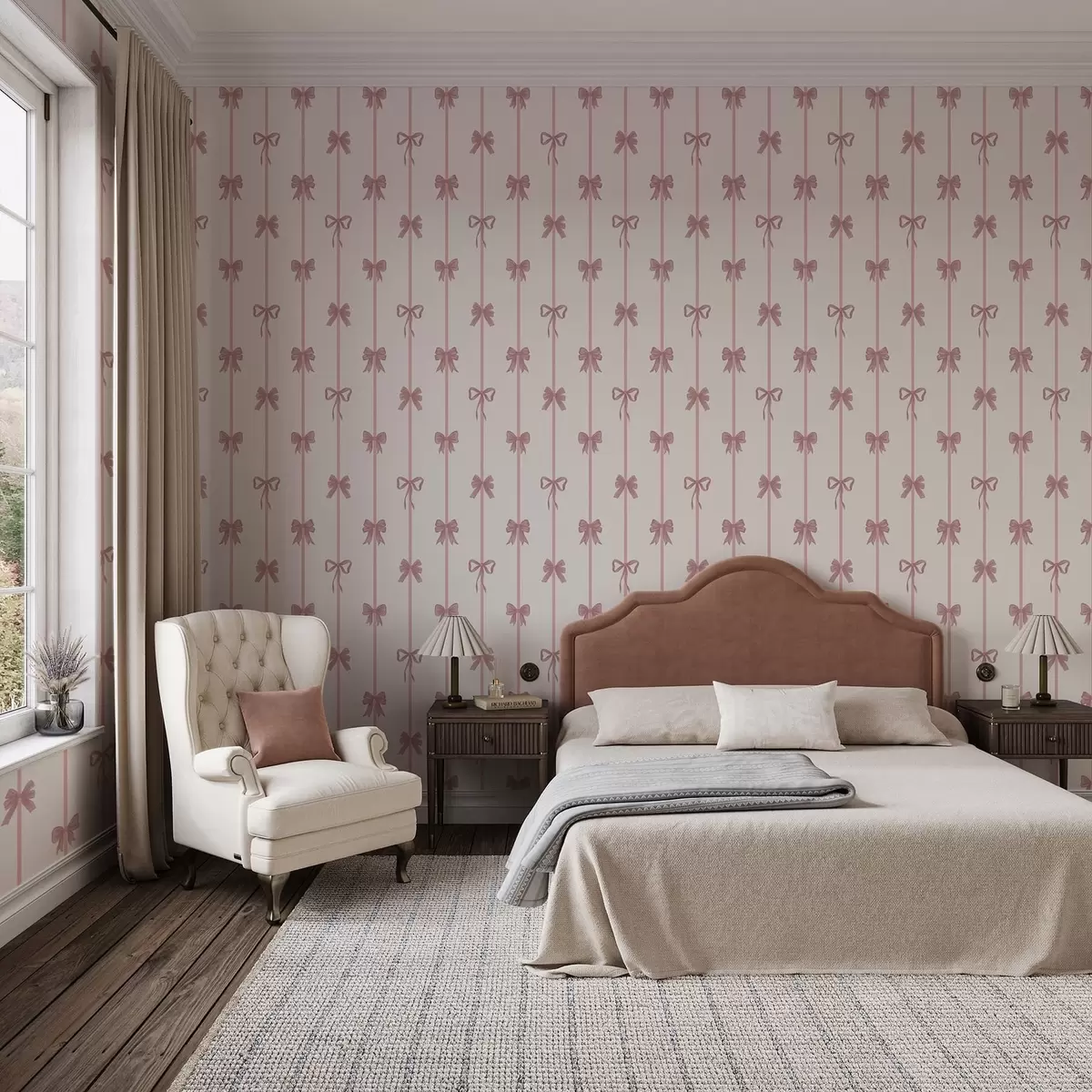 Carta da parati Fiocchi rosa con nastri su sfondo chiaro Nr. a01074