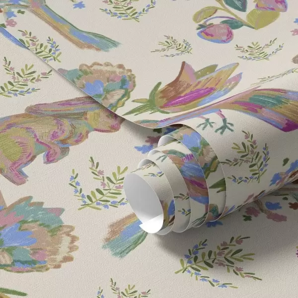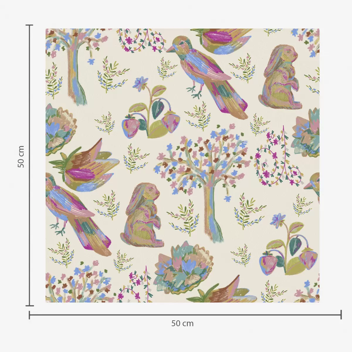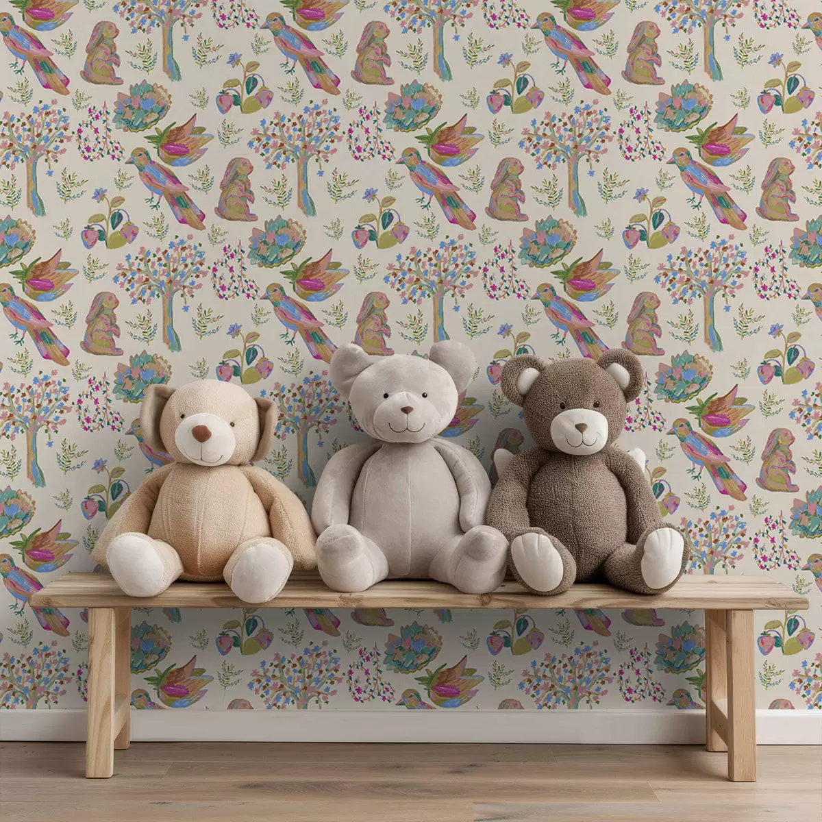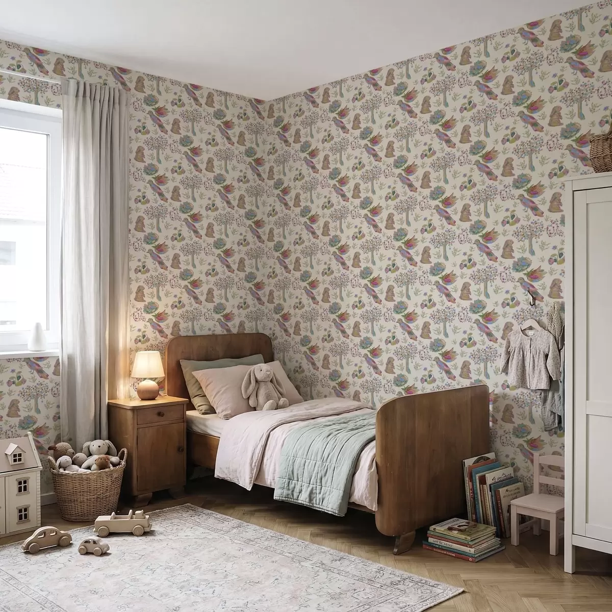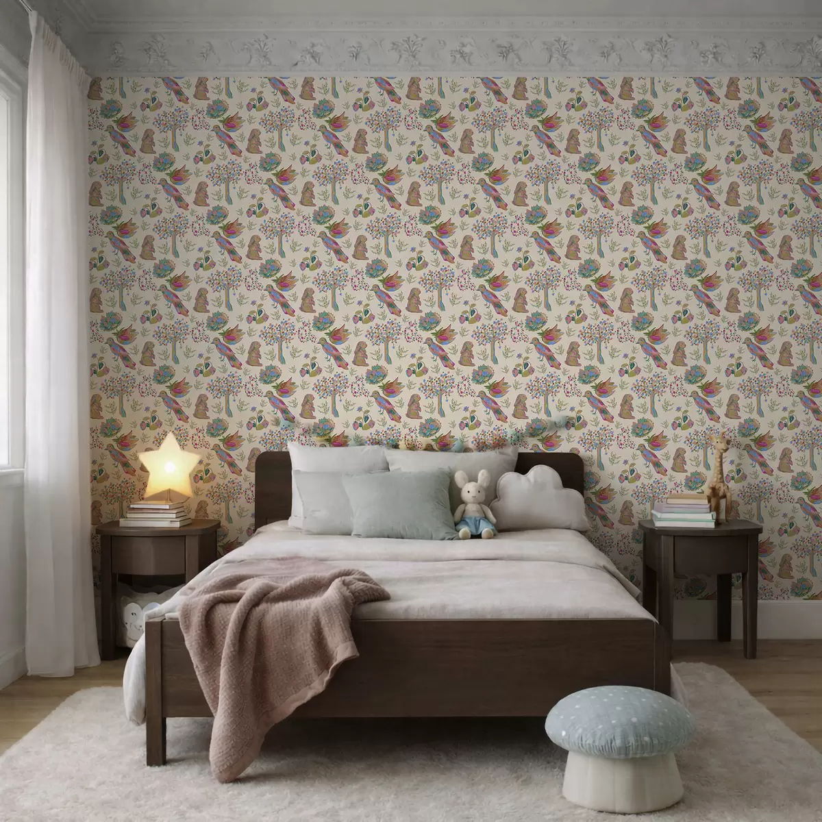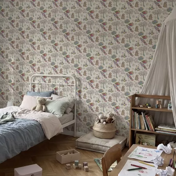 Carta da parati Motivo colorato per bambini con uccelli e coniglietti Nr. a01127