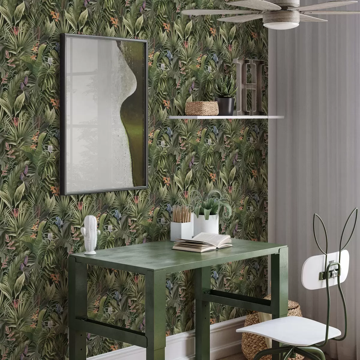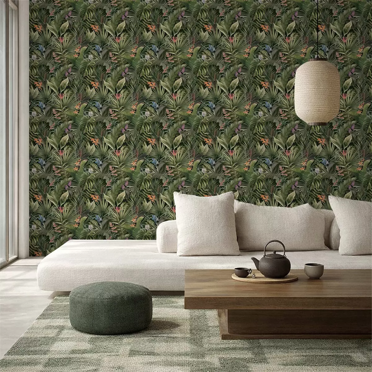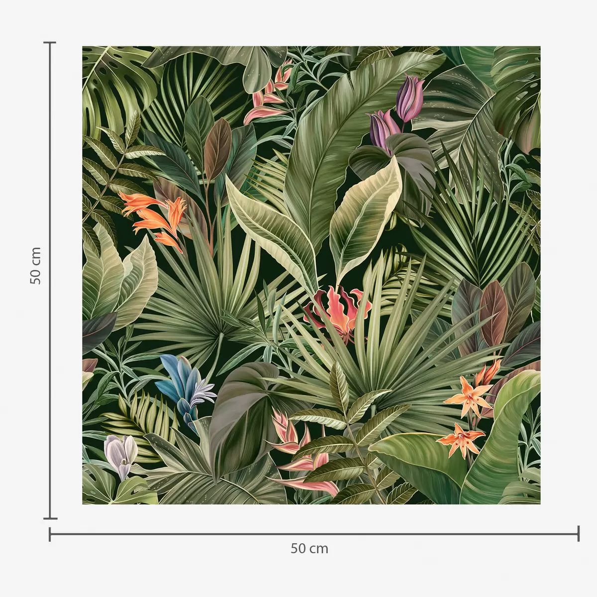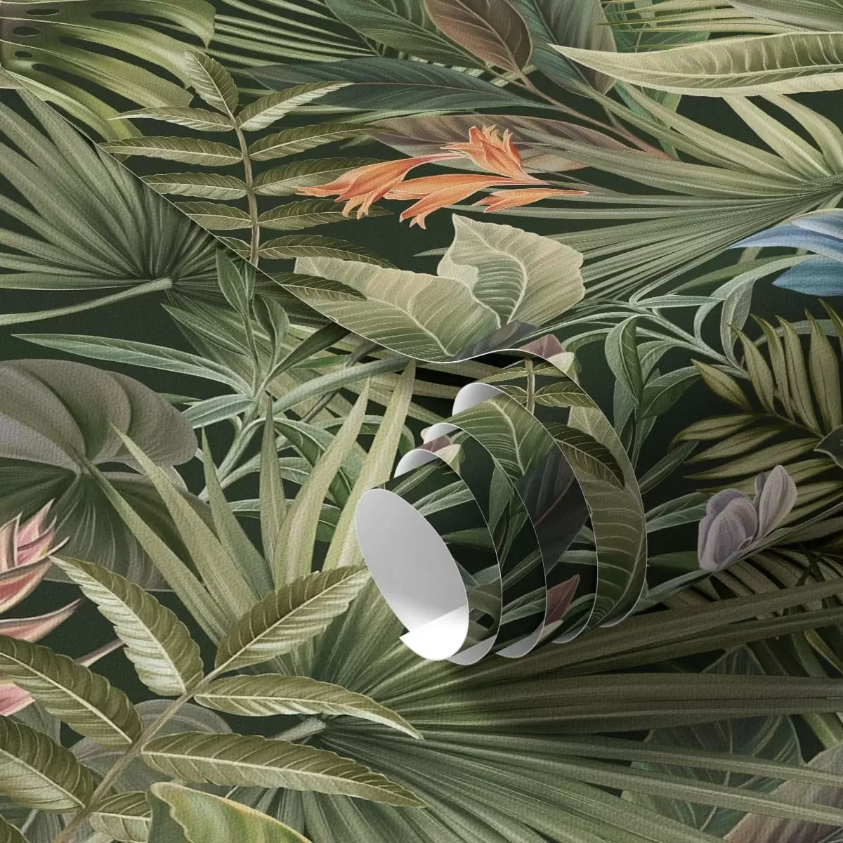 Carta da parati Foglie tropicali con fiori su sfondo scuro Nr. a01153