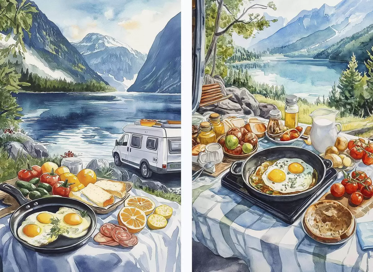 Poster Colazione nella natura, viaggio, vita all'aria aperta, stile acquerello, Norvegia Nr d00404