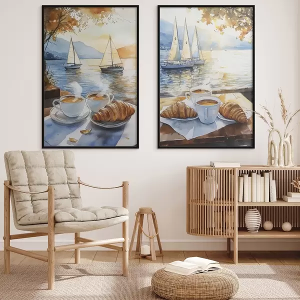 Poster Tramonto sul lago con caffè, barche a vela, natura, viaggio Nr d00407