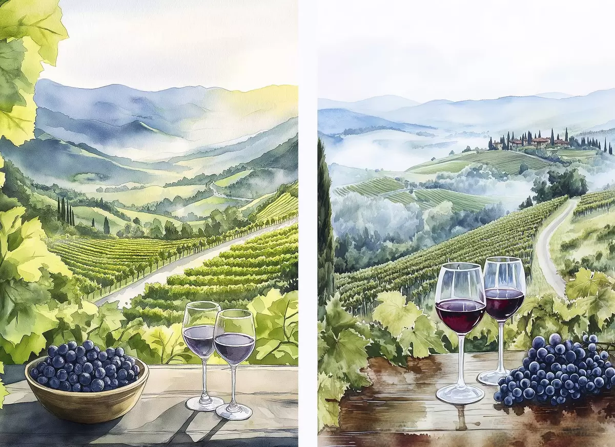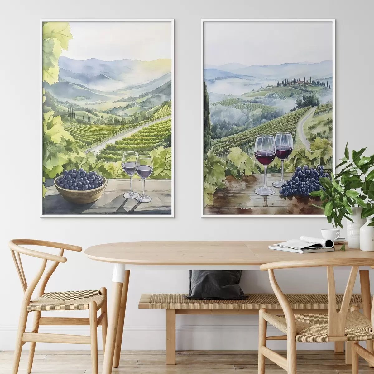 Poster Bellissimi paesaggi toscani, cantieri d'uva, bicchieri di vino, stile acquerello, Italia Nr d00408