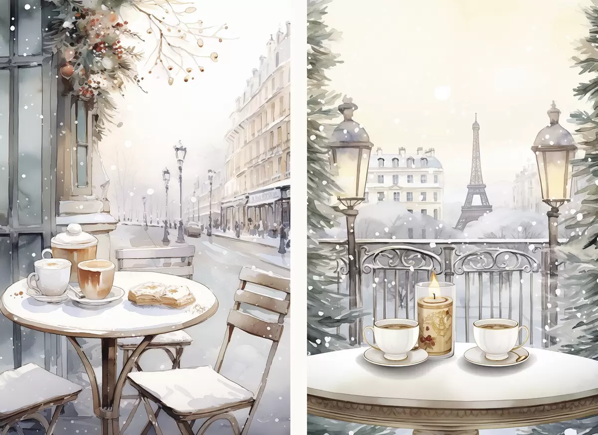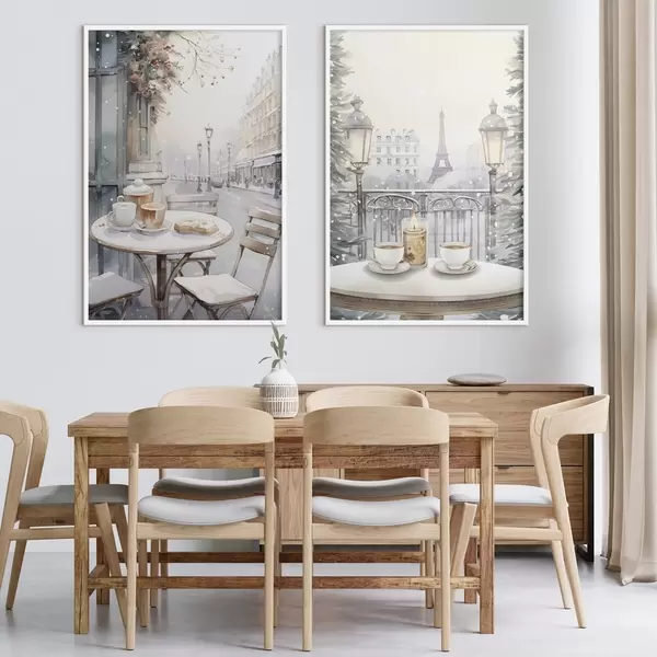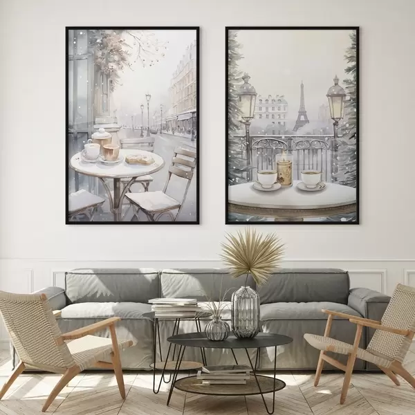 Poster Caffè estetici con tazze di caffè, strada di Parigi, inverno, architettura Nr d00413