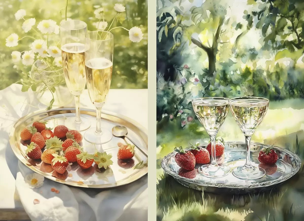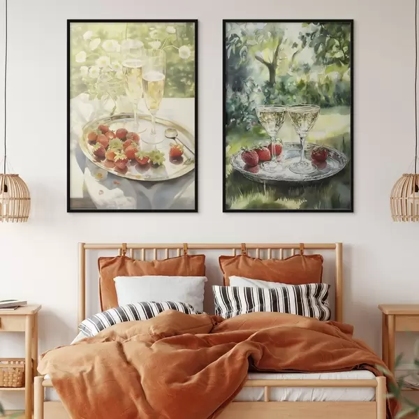 Poster Picnic estivo, bicchieri di champagne con fragole sul vassoio, fiori di camomilla Nr d00414