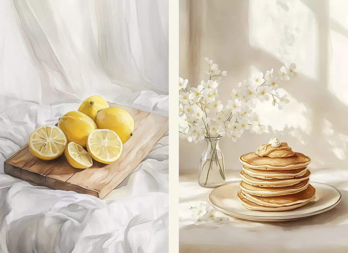 Poster Pancakes con burro di arachidi, limoni sulla tavola di legno, stile acquerello Nr d00416