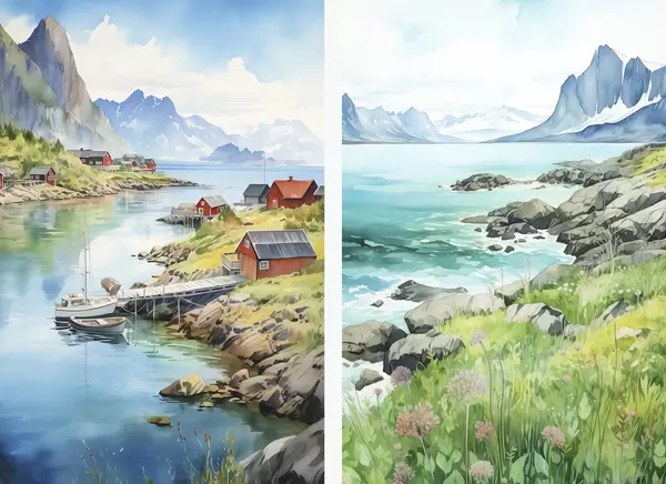 Poster Norvegia natura, isole Lofoten, paesaggio estivo, case rosse, montagne, imbarcazioni Nr d00421