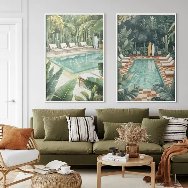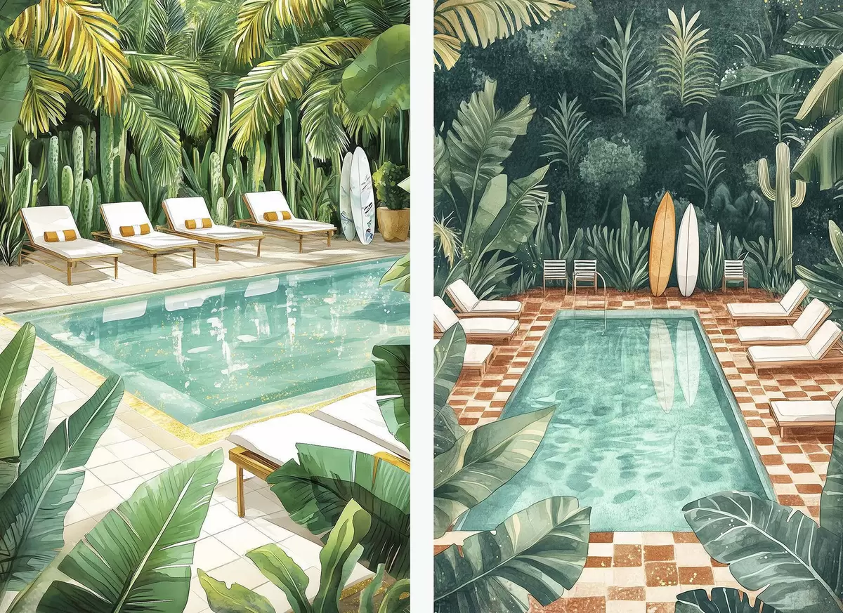 Poster Piscina estiva, vintage, foresta tropicale, verde, palme, stile acquerello d00422