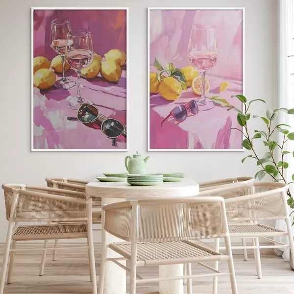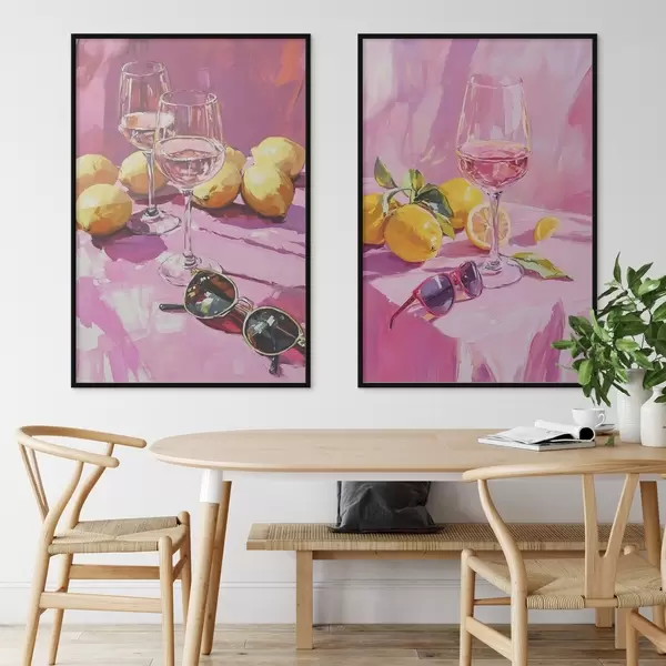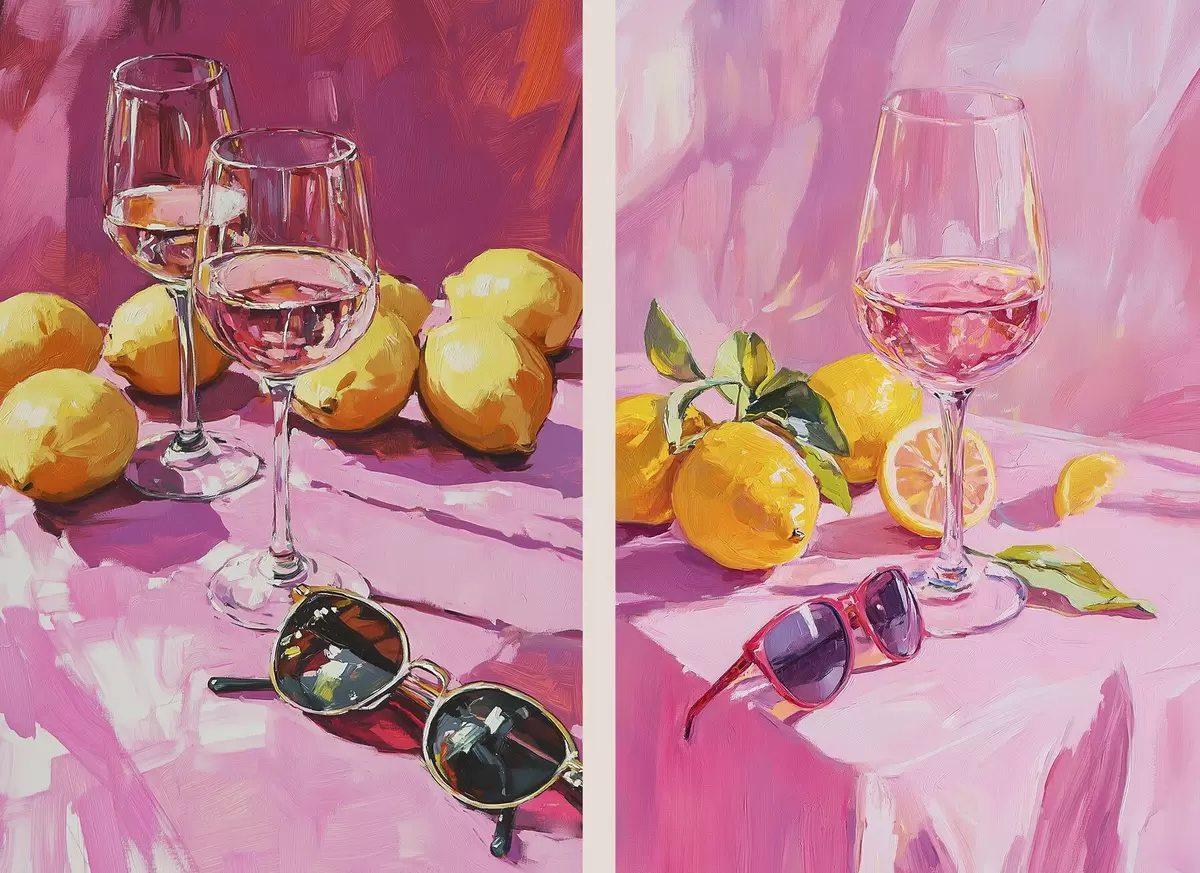 Poster Astrazione in stile olio con bicchieri di champagne, limoni e occhiali da sole, colori rosa Nr d00444