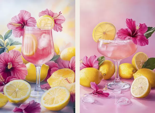 Poster Cocktail con fiori di ibisco e limoni, estivo, succoso, stile acquerello d00446