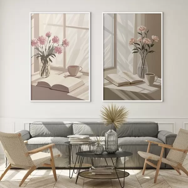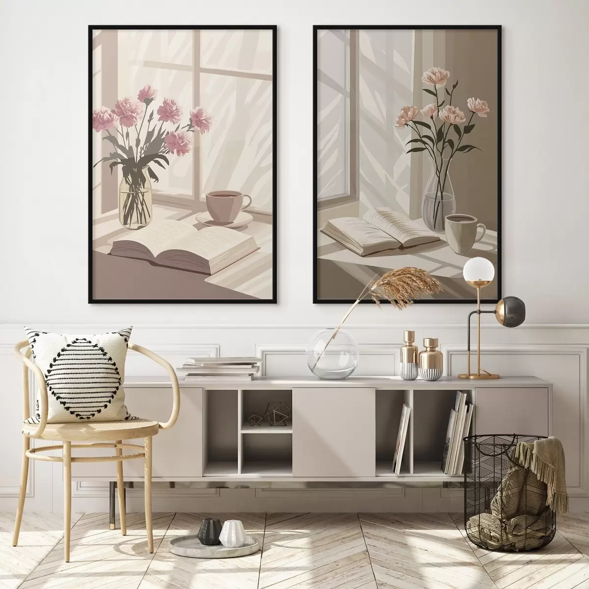 Poster Astrazione, estetica mattutina, tazza di caffè, libro, fiori Nr d00448