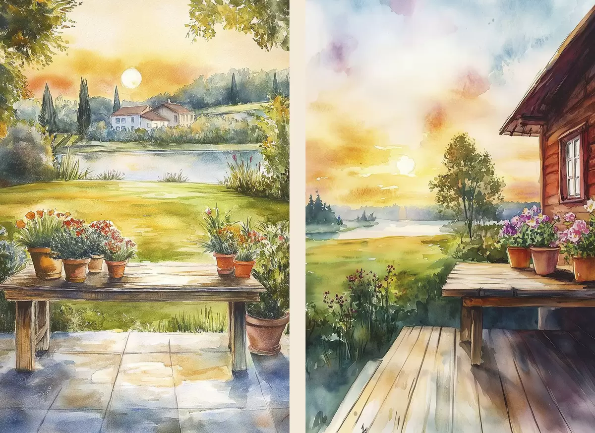 Poster Villaggio estivo, tramonto, rustico, fiori, lago, stile acquerello Nr d00449