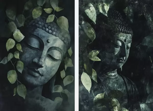 Poster Buddha verde con foglie tropicali, stile acquerello d00451