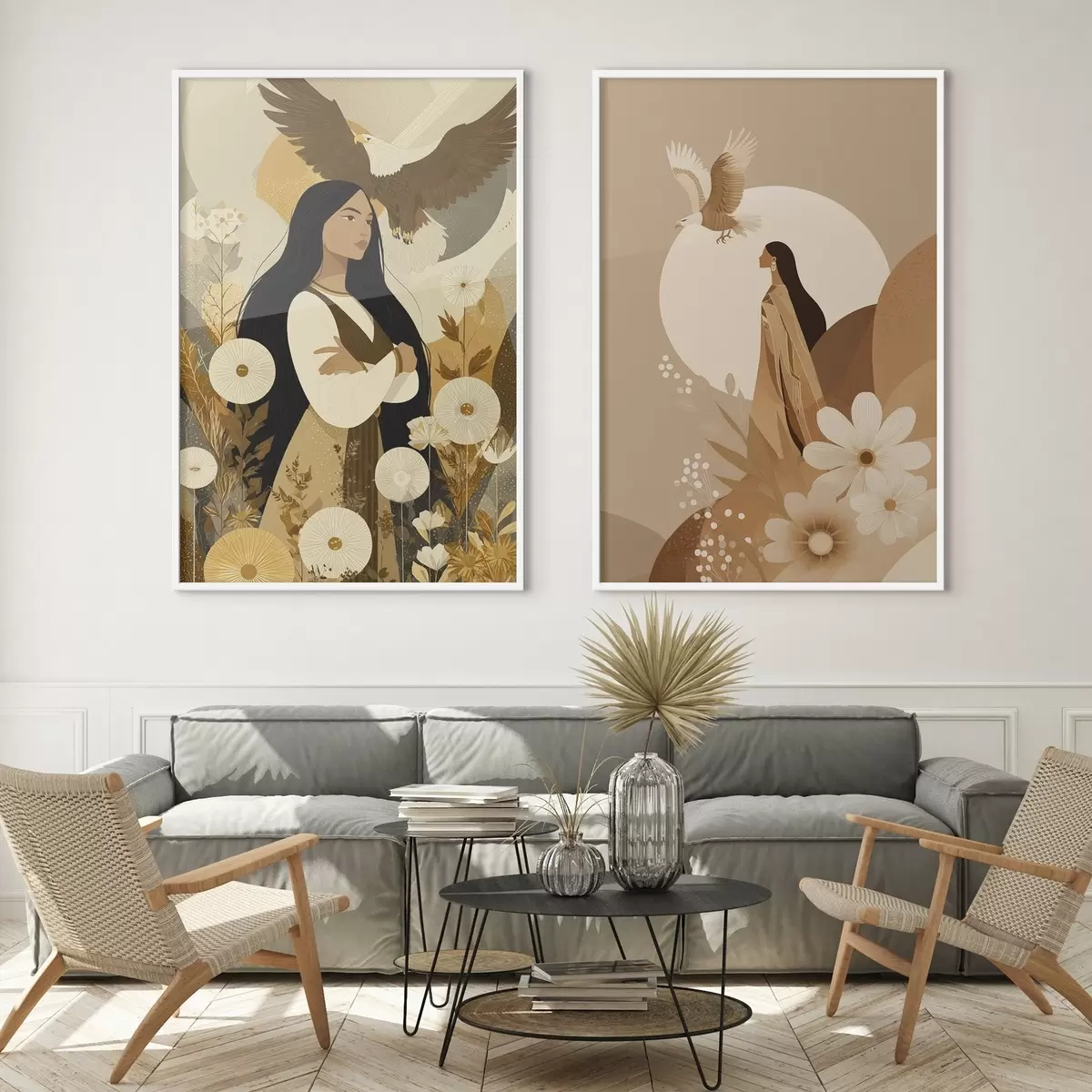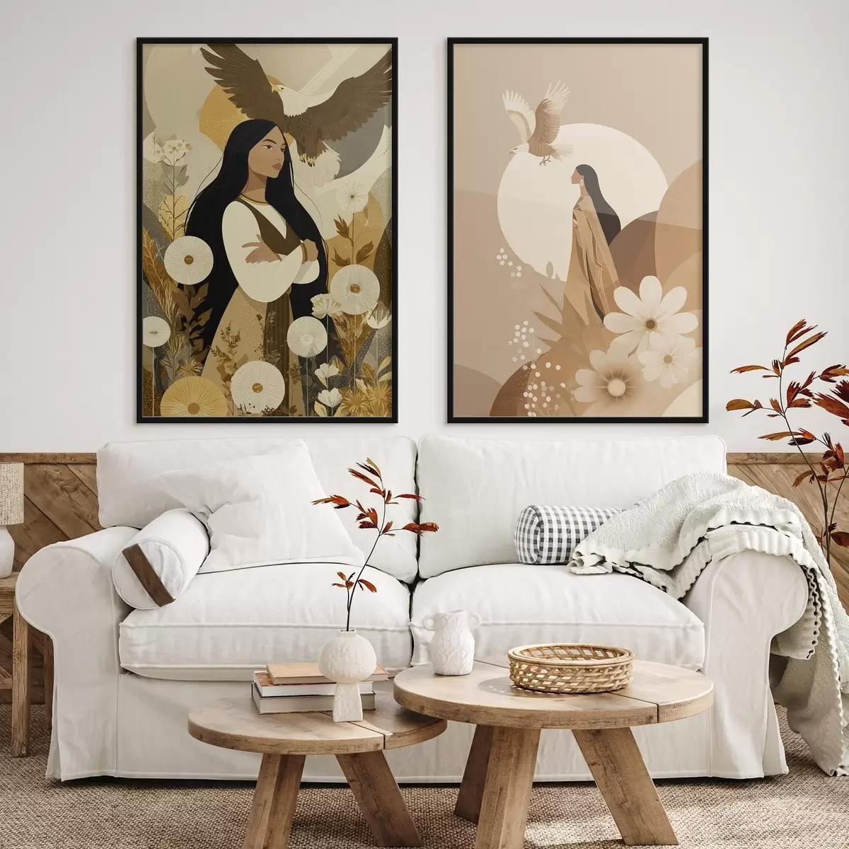 Poster Donne con aquile volanti, stile tribale, colori beige d00477