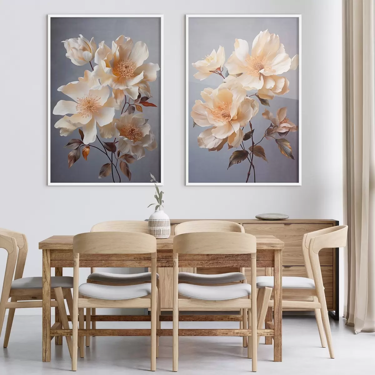 Poster Fiori strutturati con pistilli arancioni e foglie arancioni su sfondo grigio, luce morbida, elegante, dettagliato, realistico Nr d00525