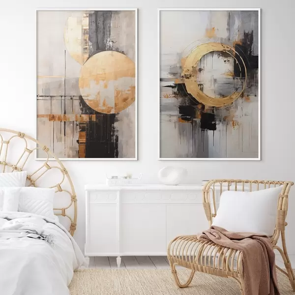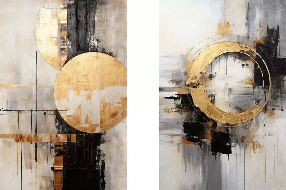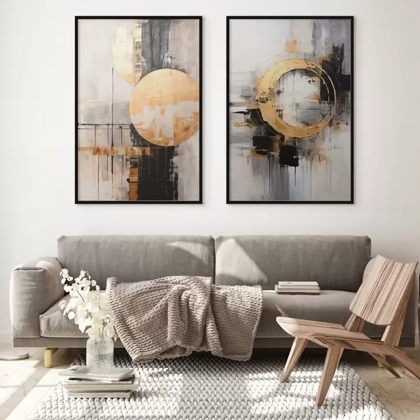 Poster Quadro astratto con cerchi, linee nere e gialle e uno sfondo con toni grigi e bianchi Nr d00527