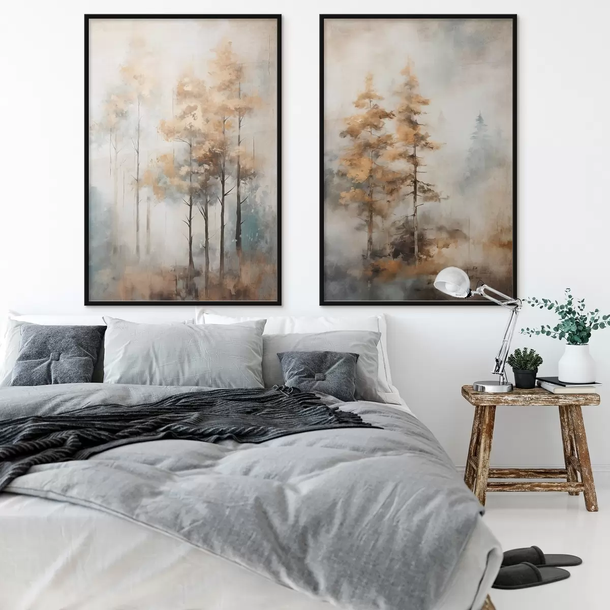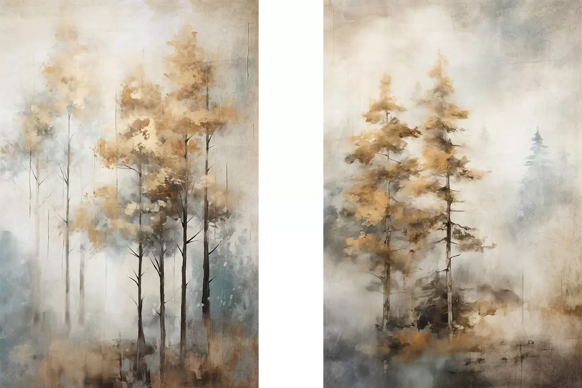 Poster Alberi alti e strutturati con foglie gialle in una foresta, lo sfondo è un mix di toni morbidi blu e marroni Nr d00528