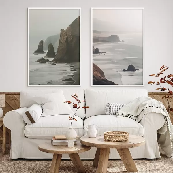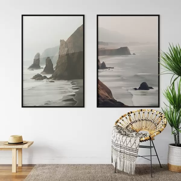 Poster Scogliere rocciose e costa marina, onde che si infrangono sulla riva, paesaggio dall'atmosfera lunatica, toni terrosi d00531