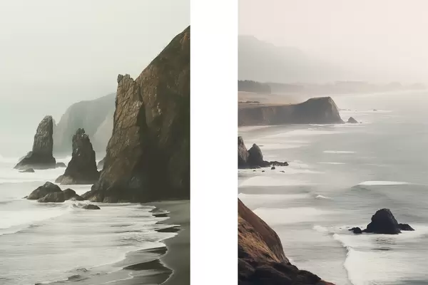 Poster Scogliere rocciose e costa marina, onde che si infrangono sulla riva, paesaggio dall'atmosfera lunatica, toni terrosi d00531