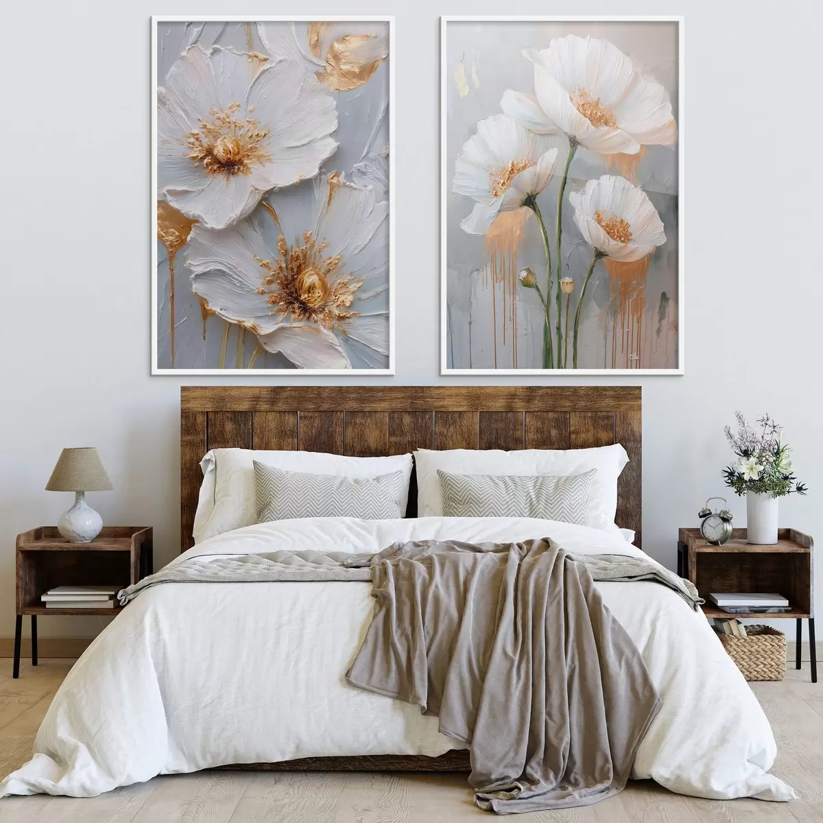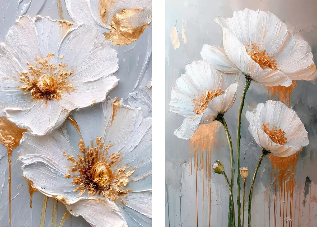Poster Quadro volumetrico di fiori bianchi con accenti dorati su sfondo grigio Nr d00568