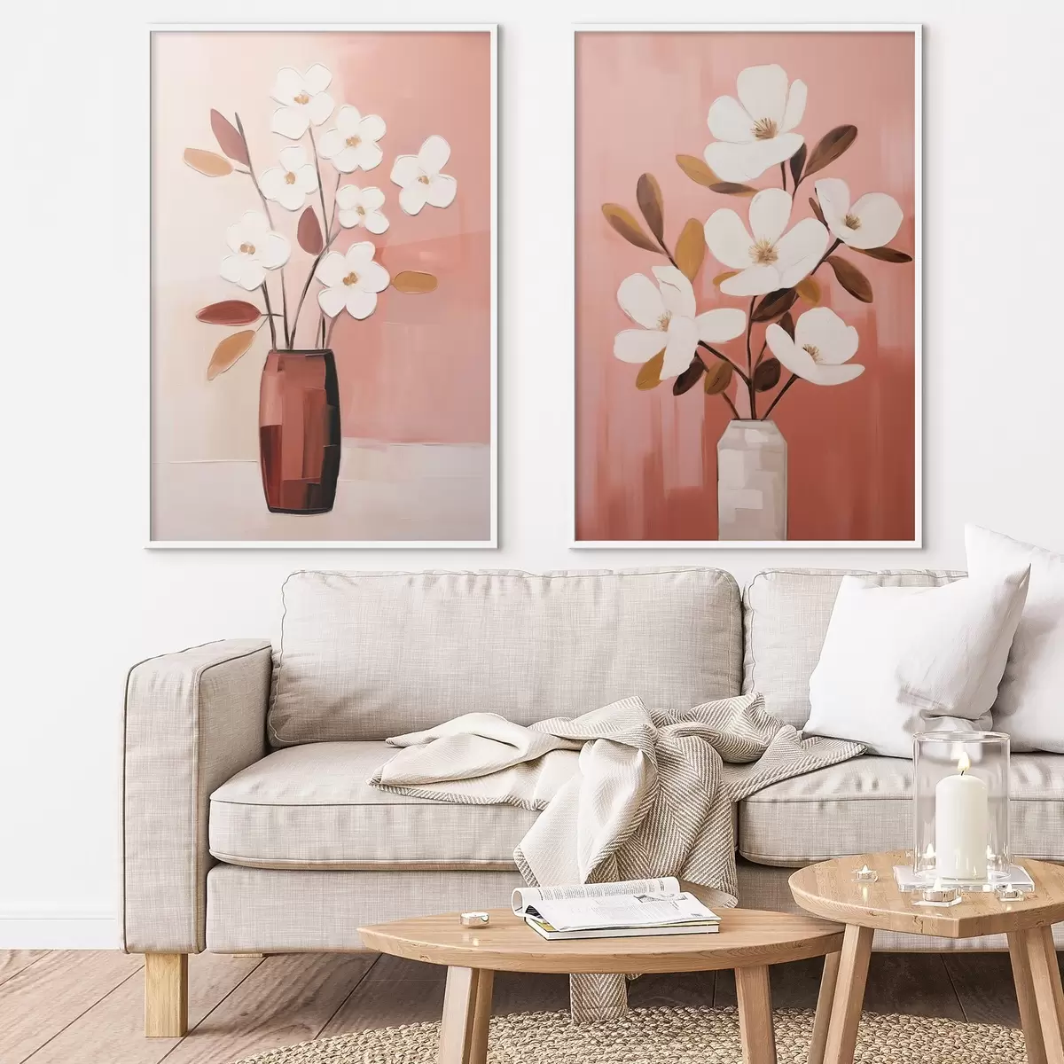 Poster Composizione con vasi a contrasto e fiori bianchi strutturati d00575