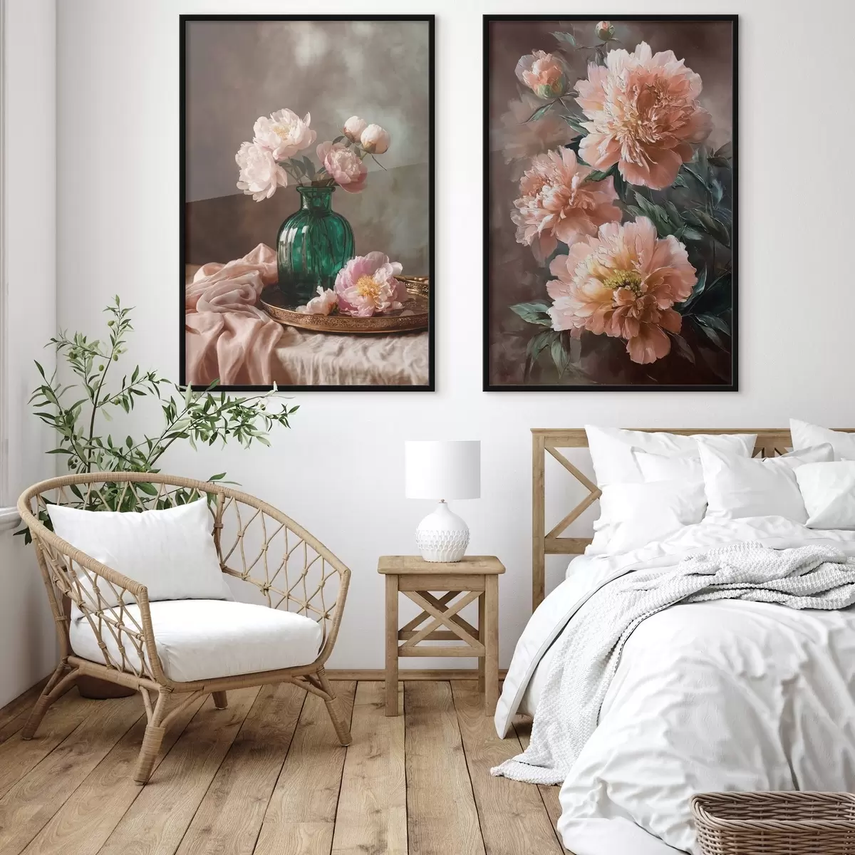 Poster Composizione abbinata con peonie rosa in vaso e su tela d00578