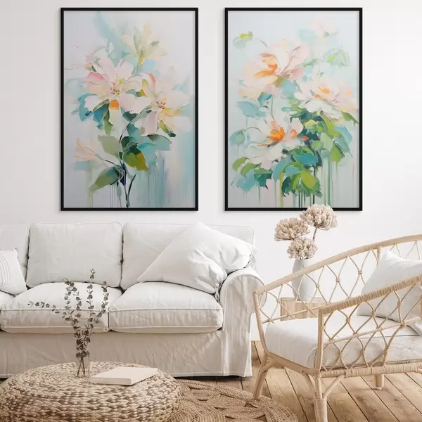 Poster Fiori di pesco bianchi e pastello, foglie verdi, imitazione di pittura ad olio con pennellate morbide, sfondo blu chiaro Nr d00644