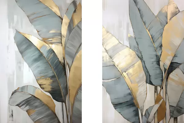 Poster Un insieme di foglie di banano blu, grigie e gialle con pennellate visibili, su uno sfondo bianco astratto Nr d00645