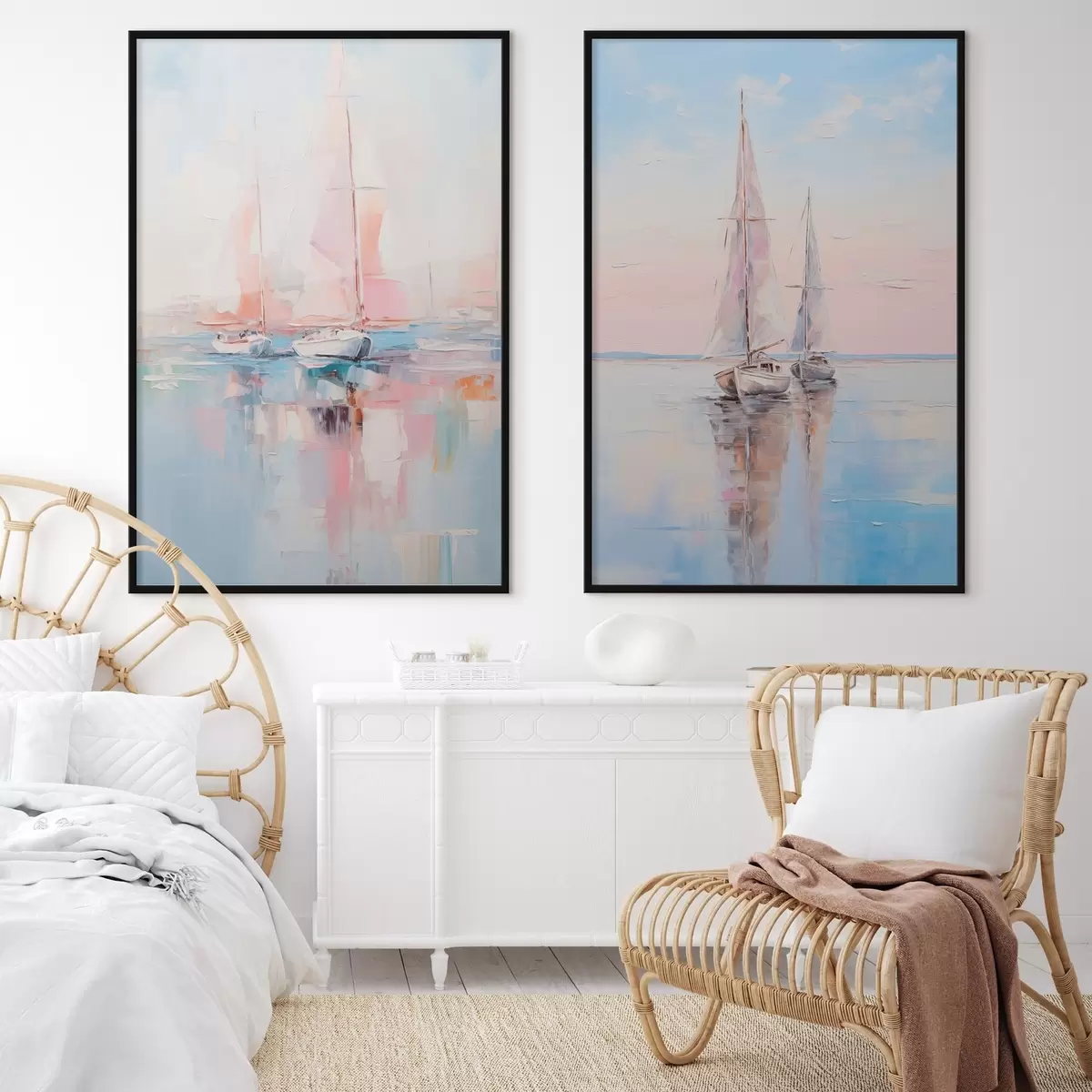 Poster Barche a vela con vele rosa che galleggiano su un mare calmo, riflessi delle barche nell'acqua, colori pastello tenui Nr d00648