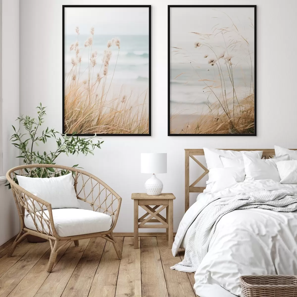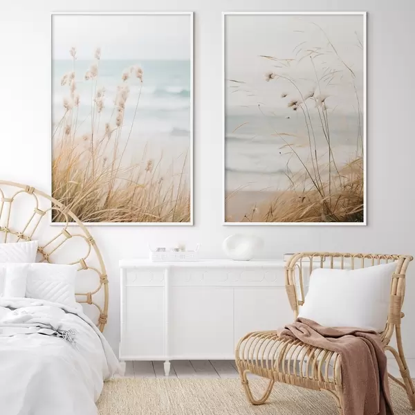 Poster Erba alta con teste di semi soffici, spiaggia sabbiosa e onde dell'oceano sullo sfondo, tavolozza di colori tenui e smorzati d00650