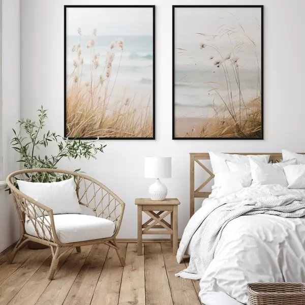 Poster Erba alta con teste di semi soffici, spiaggia sabbiosa e onde dell'oceano sullo sfondo, tavolozza di colori tenui e smorzati Nr d00650