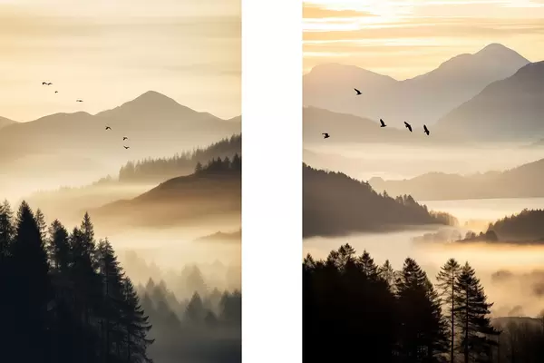 Poster Un paesaggio montano con una foresta e uccelli che volano nel cielo, il tutto coperto da uno spesso strato di nebbia durante l'alba Nr d00651