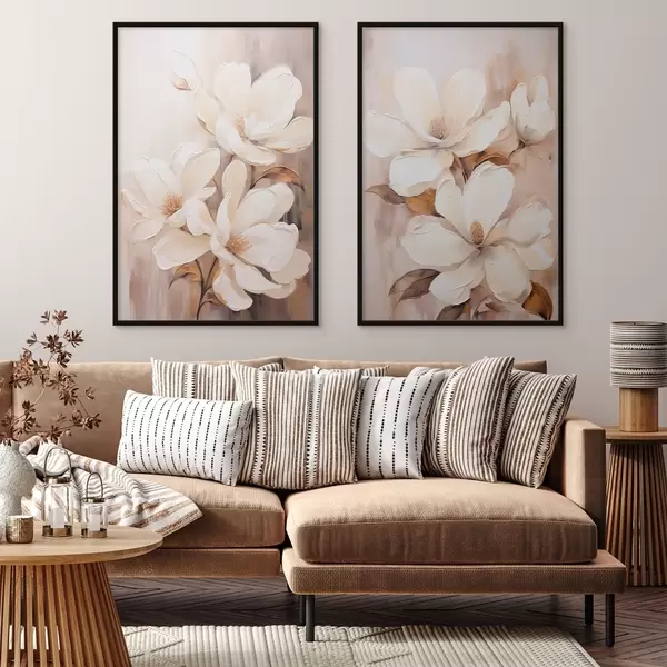 Poster Fiori di magnolia bianchi su uno sfondo morbido e sfocato di tonalità beige e marrone, stile pittura Nr d00655