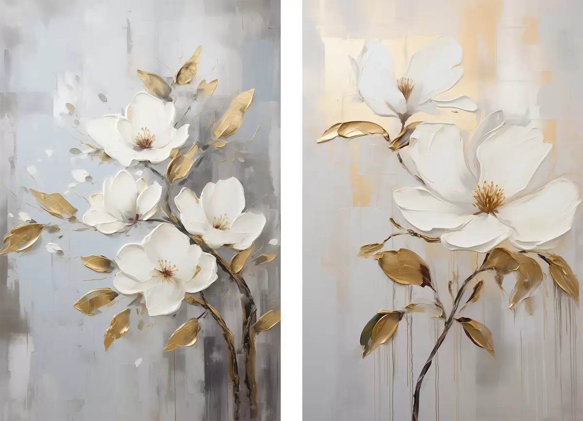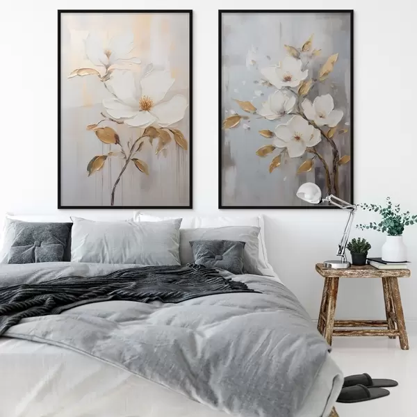 Poster Due fiori bianchi con foglie giallo-arancio su sfondo chiaro Nr d00687