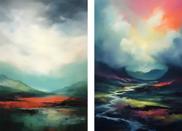 Poster Paesaggio astratto con nuvole nei toni del turchese e del rosso Nr d00691
