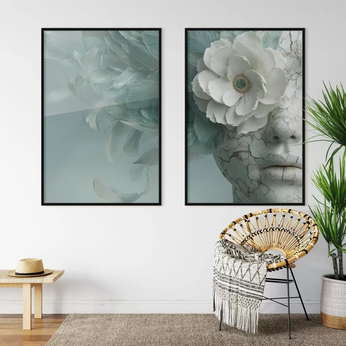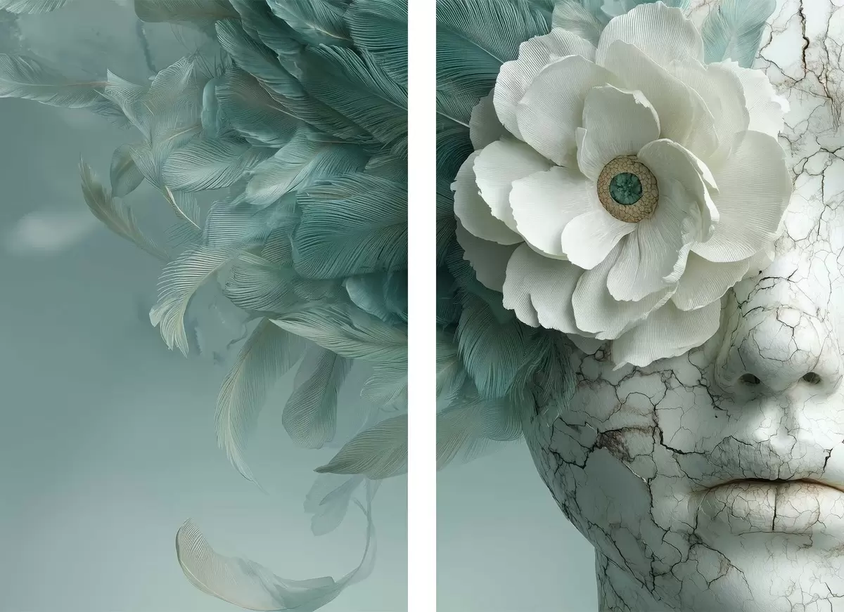 Poster faccia di marmo di una ragazza con un fiore e delle piume d00699