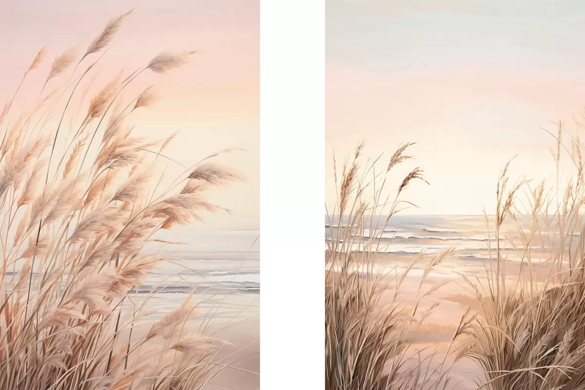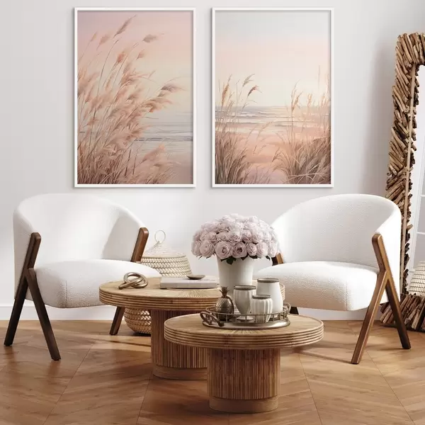 Poster Erba della Pampa con una tavolozza di colori arancione pastello, cielo rosa chiaro, un paesaggio tranquillo Nr d00823
