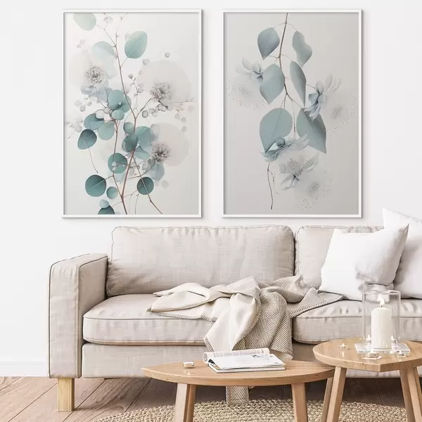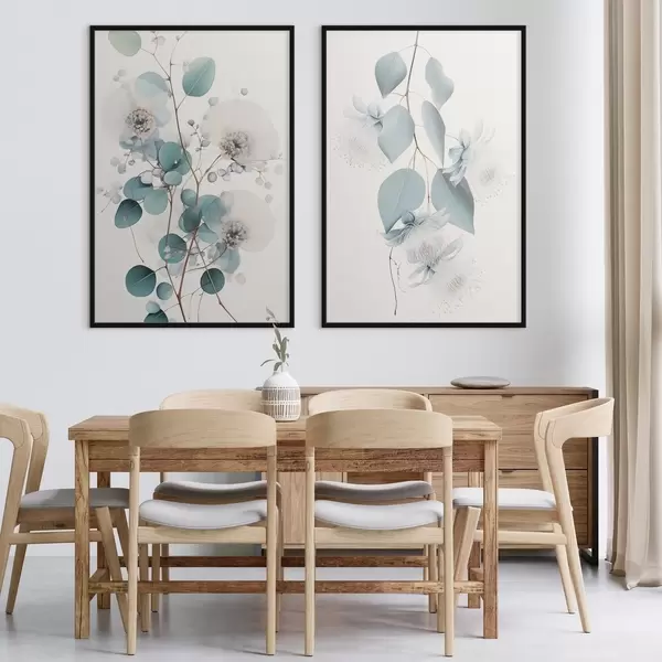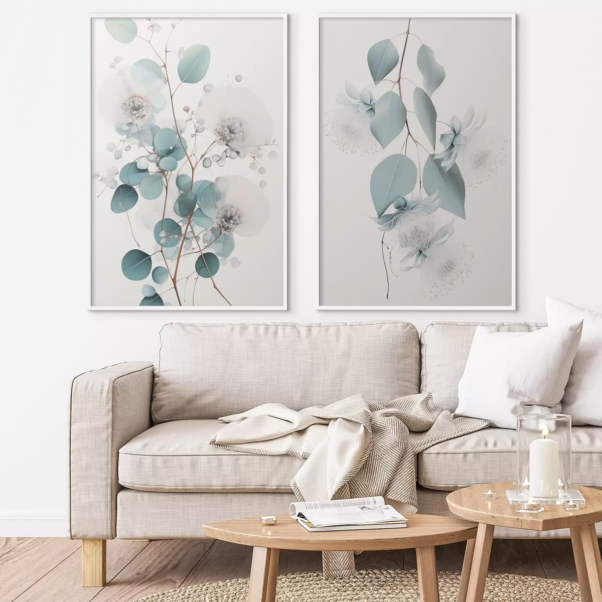 Poster Ramo di eucalipto con foglie blu e fiori bianchi, sfondo chiaro Nr d00829