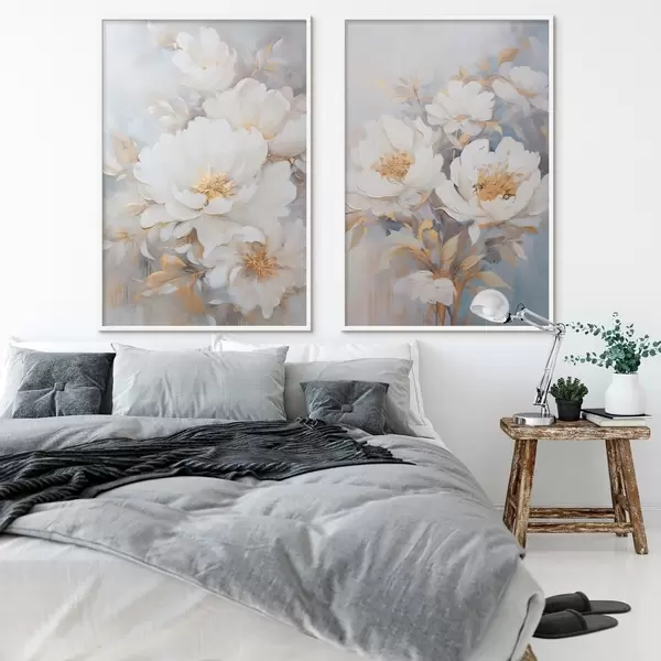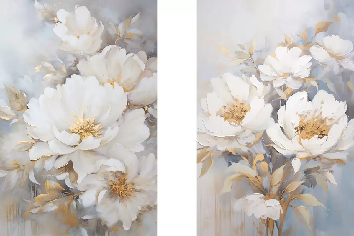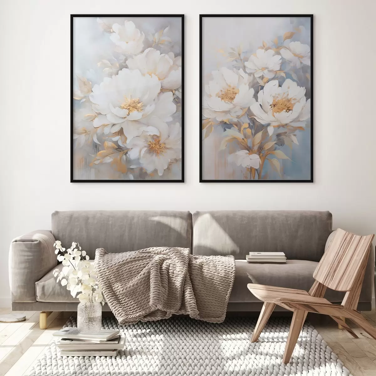 Poster Peonie bianche con centro e foglie gialle, pennellate morbide, sfondo azzurro, composizione floreale Nr d00878
