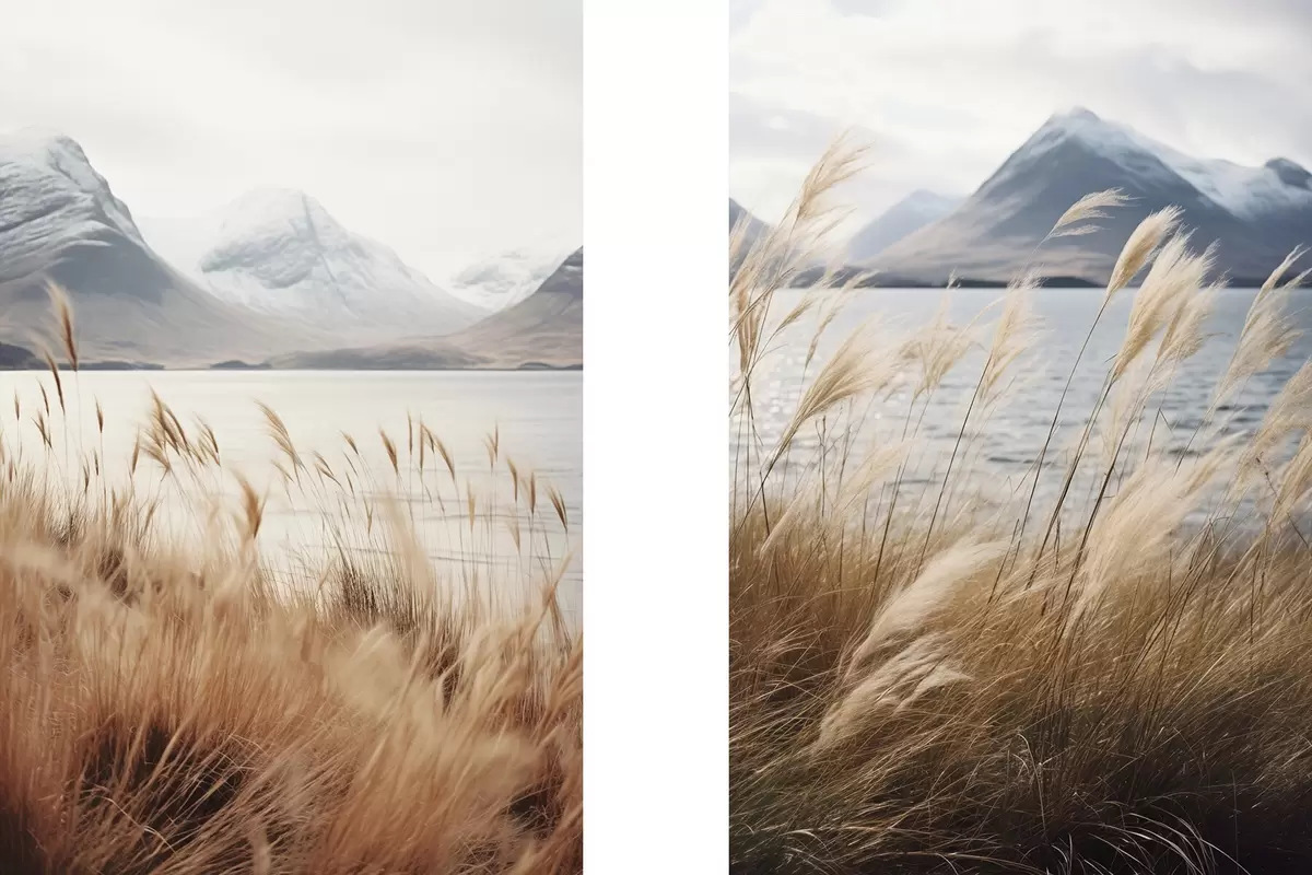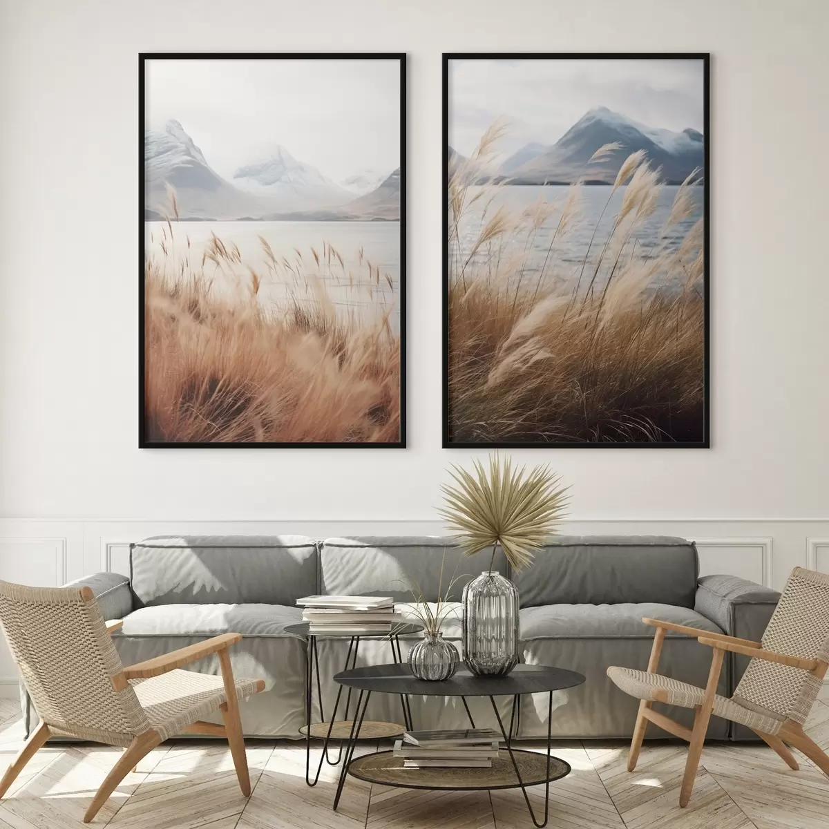 Poster Erba della Pampa con un lago e montagne sullo sfondo, illuminazione soffusa, colori tenui, stile naturalistico Nr d00884