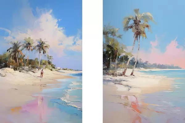 Poster Paesaggio astratto, una spiaggia con palme, una giornata di sole splendente con cielo azzurro e qualche nuvola Nr d00885