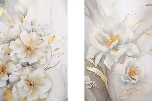 Poster Fiori bianchi con dettagli gialli, petali con sfumature delicate, sfondo chiaro con sottile effetto marmorizzato Nr d00889