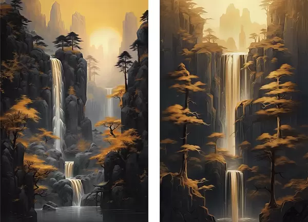 Poster Paesaggio con cascata e montagne nella luce dorata Nr d00928