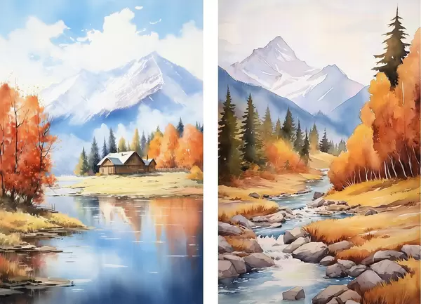 Poster Paesaggio montano autunnale con lago e fiume Nr d00929