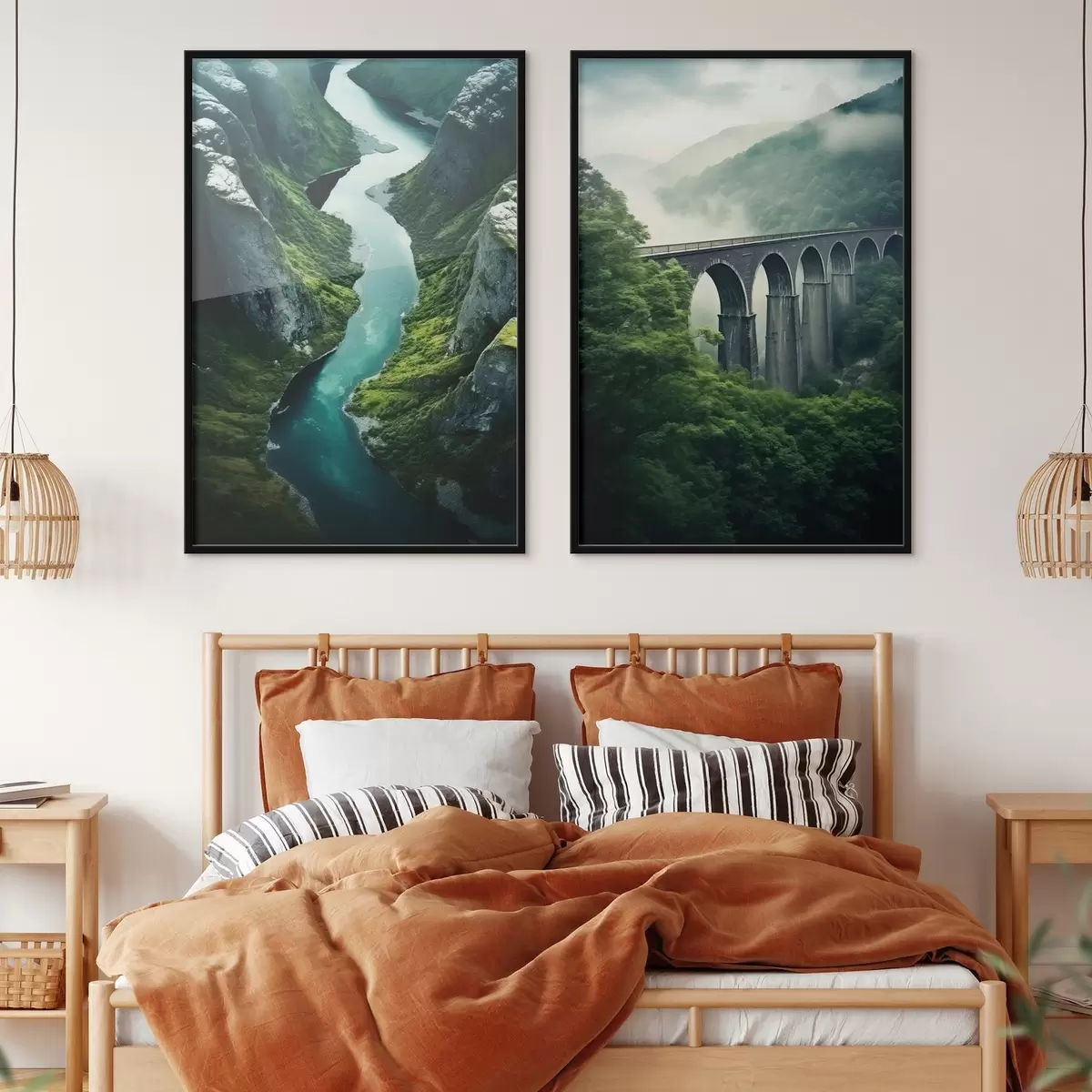 Poster Canyon fluviale aereo e viadotto nebbioso tra verdi colline Nr d00967