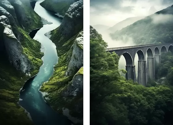 Poster Canyon fluviale aereo e viadotto nebbioso tra verdi colline Nr d00967