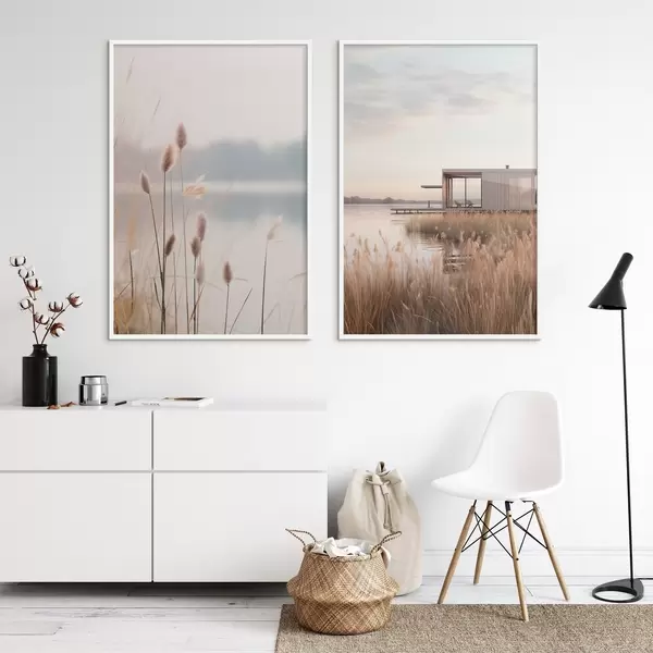Poster Canne morbide su un lago tranquillo e una moderna capanna sulla riva Nr d00970