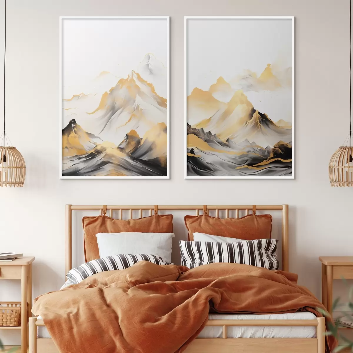 Poster Montagne gialle e nere con cime innevate, stile pittorico a inchiostro, catena montuosa minimalista Nr d01002