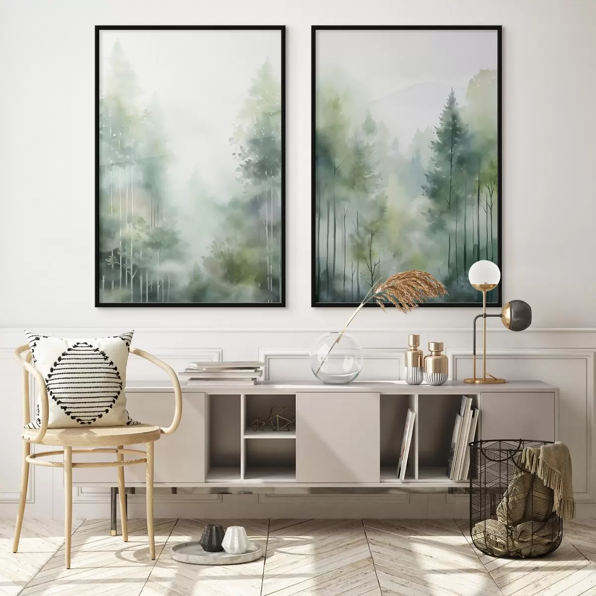 Poster Imitazione di un dipinto ad acquerello raffigurante una foresta astratta con alberi ad alto fusto e fogliame verde, colori tenui e delicati. d01005